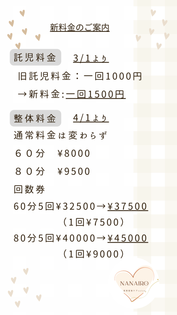 2026年3月1日より「託児料の値上げ」および2026年4月1日より「整体料金の改定」を実施させていただくこととなりました。
